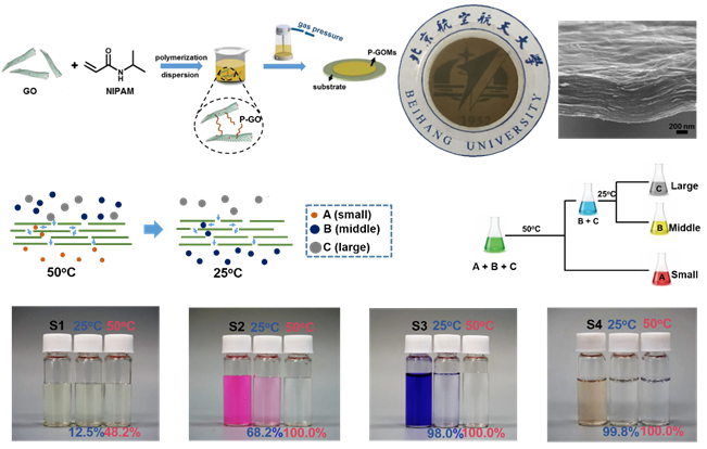 膜分离作为选择性分离领域的一种手段,在工业生产和日常生活中起着不可替代的作用。近年来,快速的城市化和工业化进程,工业污水的肆意排放和洁净生活饮用水的匮乏,让持续枯竭的淡水资源的形势变得愈发严峻。以分离膜技术为代表的解决方案,引起了广泛地关注和重视。我校久久精品网赵勇教授、王女副教授课题组近年来在高效液体分离膜领域取得一系列进展:使用静电纺丝技术结合其它合成手段制备了浸润性可调的纳米纤维膜,可用于高效油污吸附分离(Nanoscale2015,7, 2625);利用二元协同互补理念制备了大通量连续化油水分离器(J.Mater. Chem. A, 2016,4, 4365);使用静电纺丝技术及水热合成的方法,仿生制备了具有树枝状多级结构的无机纤维膜,可实现高效乳液的分离(J.Mater. Chem. A, 2016, 4, 12014;J.Mater. Chem. A, 2017, 5, 16134);通过构筑具有多尺度结构网膜并精确调节其表面能,实现了基于有机液体表面张力差异的非水体系混合有机液体分离(NPGAsia Mater.2016, 8, e334;Small,2017, 13, 4)。在前期多相液体分离膜工作的基础上,赵勇教授、王女副教授课题组进一步制备了具有仿生温度响应的石墨烯分离膜用于水门控及混合分子分离。在之前研究中,氧化石墨烯分离膜的孔径无法实现简单的原位调控,从而限制了其应用。该工作从自然界中获得灵感,模仿植物(如仙人掌)叶片在高温下气孔关闭调节水蒸发通量从而维持生命这一功能特性,仿生构筑了“高温闭孔,低温开孔”的氧化石墨烯膜。作者通过自由基聚合反应将温敏性高分子聚(N-异丙基丙烯酰胺)与氧化石墨烯共价连接,制备了孔径可受温度原位调控的氧化石墨烯分离膜。该分离膜在纳滤尺度上表现出优异的性质,并且通过其温度响应性质可实现不同尺寸混合分子的梯度分离。此研究拓展了智能响应分离膜的应用领域,为水净化、精细化工分离等提供了新的处理思路,同时该膜在微流控及智能反应器领域均有着潜在的应用。