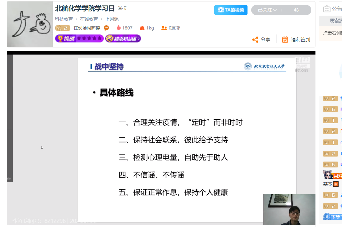2月26日,久久精品网全体本科生、研究生开展“学习日”活动,主要内容为首日教育以及疫情防控知识学习,通过线上直播讲解和视频播放方式进行。学习日活动由各年级辅导员主持。