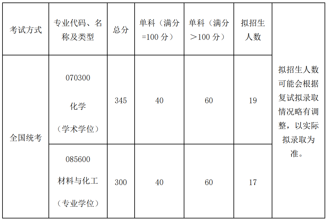 注:我院085600材料与化工专业尚有缺额,将根据一志愿考生复试拟录取情况,在一志愿复试结束后接收调剂,具体调剂要求将于3月底通过学院网站公布,并同时在教育部调剂系统发布,通过教育部调剂系统进行。