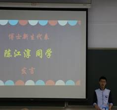 随后,在三位学生代表发言环节,2019级硕士新生代表罗翌飞同学总结了自己在本科期间做科研的体会。2019级博士新生代表陈江淳同学则告诉大家对于科研,不仅要有脚踏实地的态度,也要有敢为人先的胆识。而2017级博士李超同学作为在校生代表,则给出了科研路上的中肯建议:一定要把发现、解决问题的能力培养起来。